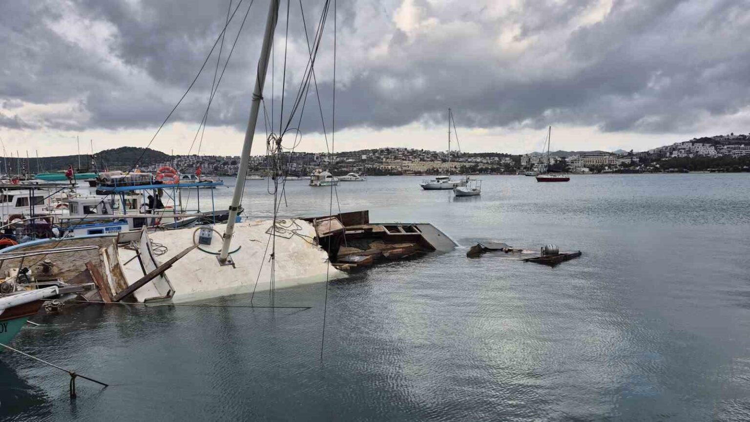 Muğla’nın Bodrum ilçesinde etkili olan kuvvetli rüzgarda yelkenli bir tekne su alarak yarıya kadar battı.